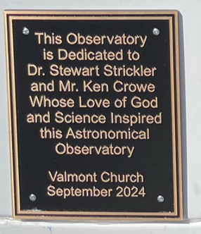 In 2024, members of Valmont Church organized, fabricated and dedicated a 10-foot diameter professional Observatory, complete with a state-of-the-art telescope mounted on a permanent pier. The VOG plans to hold multiple events for church members and the public, with our new capabilities. On September 27th, the church held an open-to-the-public “First-Light” event dedicating the observatory to past Valmont members, “Stu” Strickler and Ken Crowe. The event attracted over forty people from the church and community and was considered a great success.
